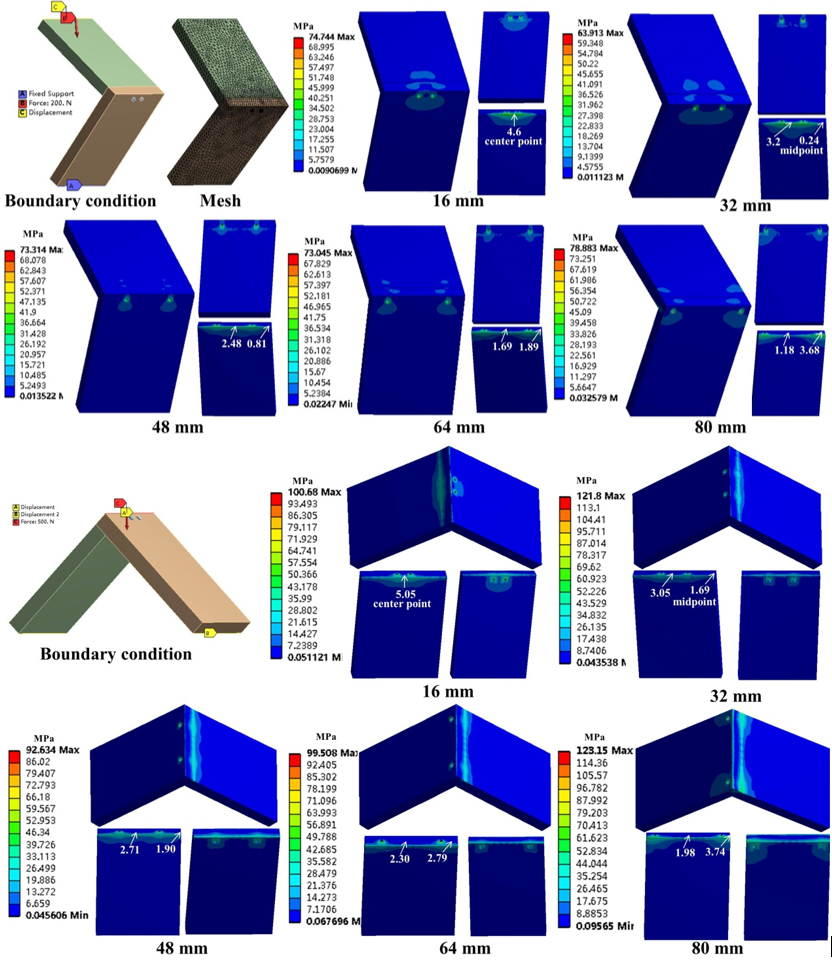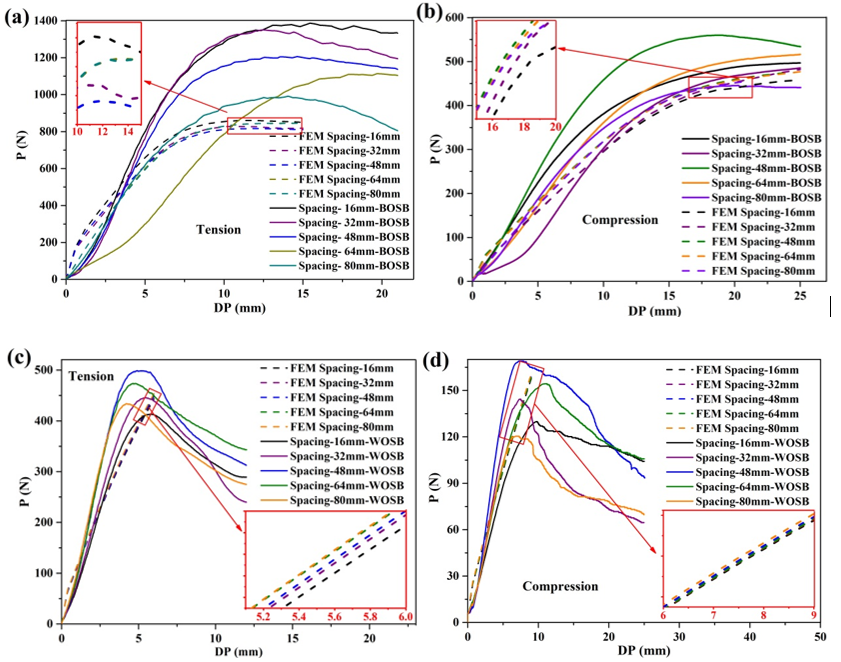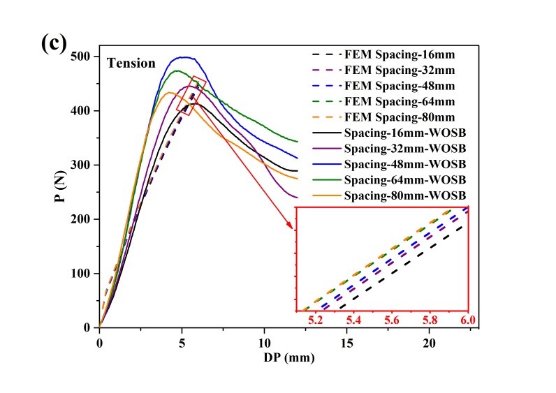 该研究以竹定向刨花板,利用有限元分析和物理实验相结合的方法对角构件的拉伸和压缩强度研究螺钉安装间距对竹定向刨花板(BOSB)和木定向刨花板(WOSB)角构件弯曲强度和刚度的影响。结果发现与WOSB相比,BOSB具有较高的拉伸强度,而且构件失效是由于螺钉发生屈服,因此BOSB构件具有较高的强度和韧性。BOSB构件破坏弯矩约为WOSB构件的2.5倍。通过有限元分析结果也验证了这一点。另外,螺钉间距为48mm时,构件上最大等效应力较小,弯曲强度和刚度较大,是最为合适的螺钉安装间距。
