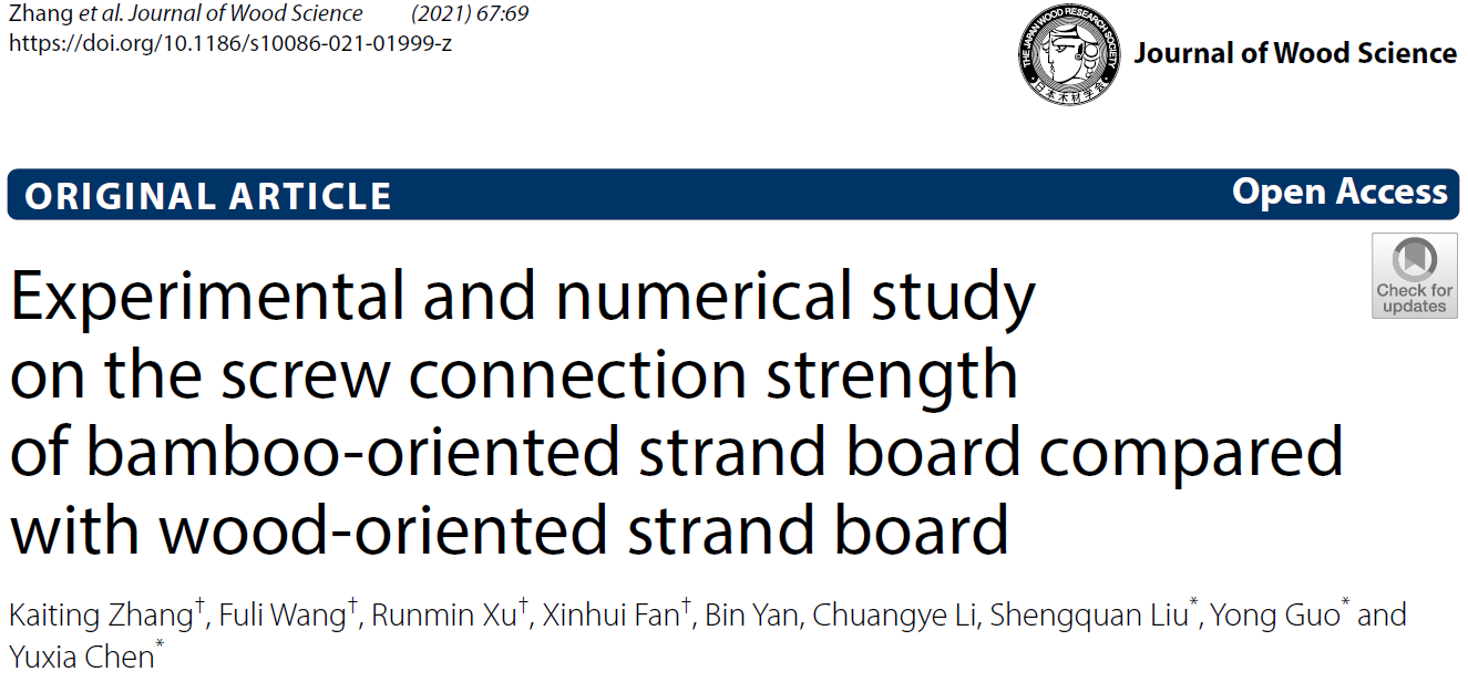 2021年12月15日,中科院2区期刊《Journal of Wood Science》(影响因子2.17)发表了一篇题为“Experimental and numerical study on the screw connection strength of bamboo‑oriented strand board compared with wood‑oriented strand board” 的研究性论文,木材科学与技术专业博士生张凯婷、徐润民、林业工程专业研究生范鑫慧以及王福利老师作为共同第一作者,通讯作者是本研究中心的陈玉霞与郭勇教授。
