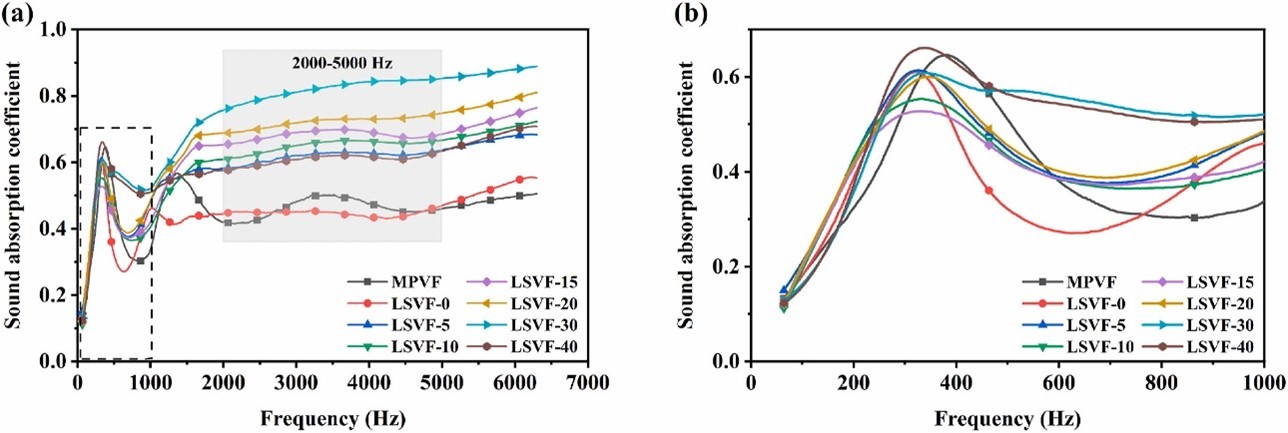 近日,我研究中心联合麒盛科技有限公司、维斯科海绵有限公司在国际期刊Journal of Cleaner Production(中科院一区,IF =9.297)在线发表了题为 “Novel polyurethane viscoelastic foam modified with discarded luffa seed oil in accordance with cleaner production”的研究论文。(图1)。该研究将天然丝瓜籽油作为改性剂,用于改性传统聚氨酯粘弹性泡沫,开发出具有优异吸声性能和散湿性能的丝瓜籽油基聚氨酯粘弹性泡沫(图2)。丝瓜籽油的加入可丰富泡沫的孔隙结构以及泡孔表面粗糙度,进而增加声波与泡孔壁的摩擦振动(图3)。更加丰富的孔隙结构使丝瓜籽油基聚氨酯粘弹性泡沫的吸声性能在2000-5000 Hz 的频率范围内提高了近100%(图4)。