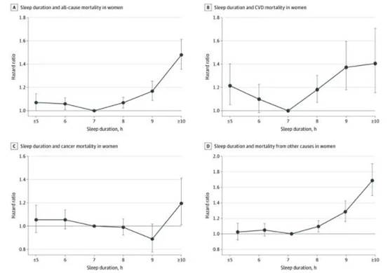 来自亚洲四国的研究团队对包括来自日本、中国、新加坡和韩国的共322721名参与者(平均[SD]年龄,54.5[9.2]岁;178 542[55.3%]名女性),随访中19419名男性死亡(男性的平均[SD]年龄,53.6[9.0]岁),13768名女性死亡(女性的平均[SD]年龄,55.3[9.2]岁)的个人水平数据的队列进行研究,以7小时为参考类别。主要的暴露因素是自我报告的睡眠时间,主要的结局指标是死亡率,包括死于所有原因、心血管疾病、癌症和其他原因。