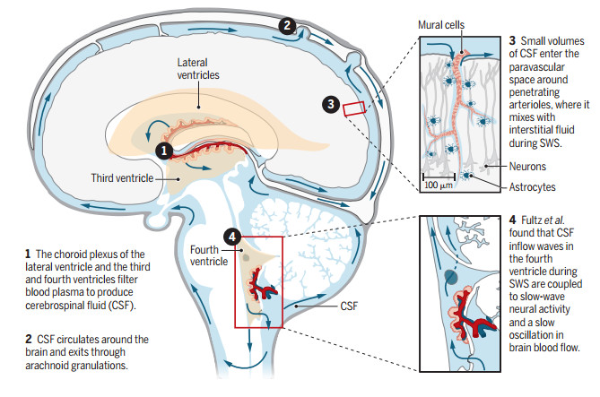 除了这一点,Lewis还后续发现,脑脊液平均每20秒就会往大脑中涌进一次。在脑脊液进入大脑之前的数秒钟前,血液会迅速退出大脑,给大脑腾出更多的容量,并且还会伴随有节律的慢波脑电信号。这意味着,在我们执行慢波睡眠时,大脑就会反复上演着“清洗”工作。
