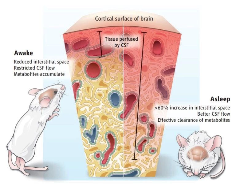 除了这些表面的效应,科学家也一直在探索睡眠影响大脑功能的机制。其中最经典的,当属2013年在《科学》上发表的一项突破性进展。当时来自美国罗彻斯特大学的神经科学家Maiken Nedergaard发现大脑有一套排污系统,大脑可以在睡觉时,通过该系统将清醒时产生的毒素蛋白排出去。
