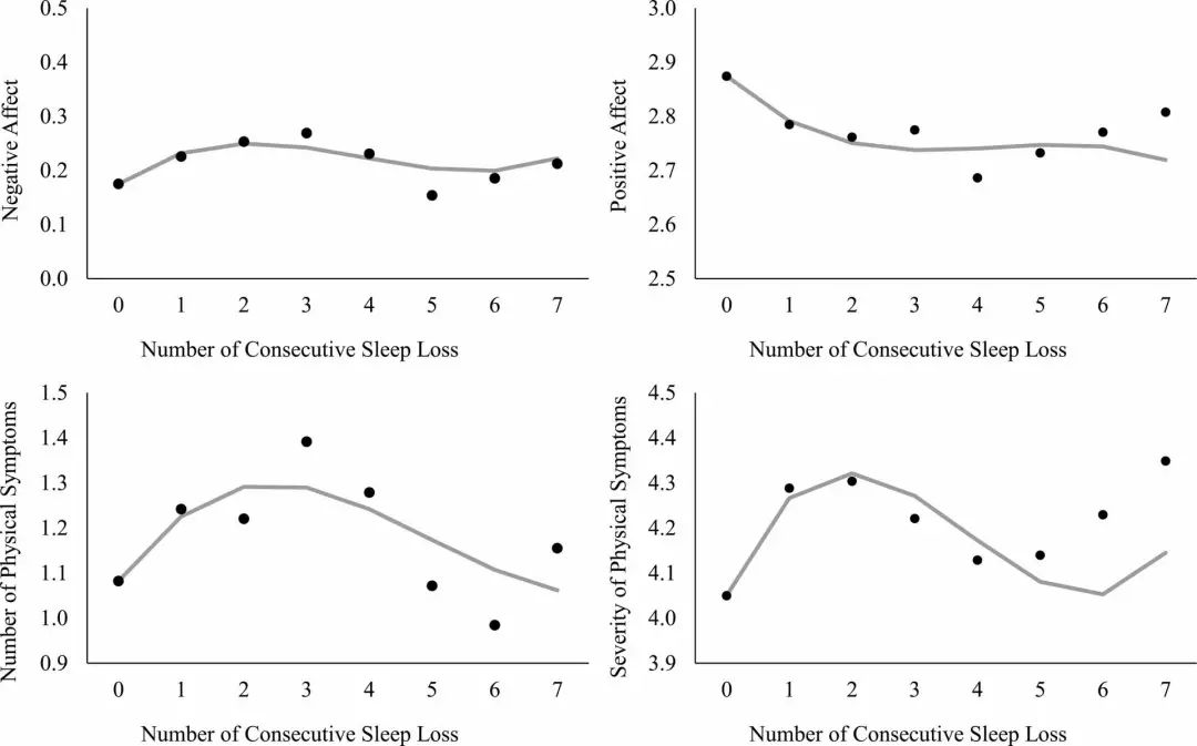 研究共收集了1,958名成年受试者,对他们进行为期8天的睡眠检测,并要求他们提供心理和身体状况记录(包括:14种消极心理、13种积极心理、28种身体症状等)。<6小时的睡眠被认为是睡眠不足。