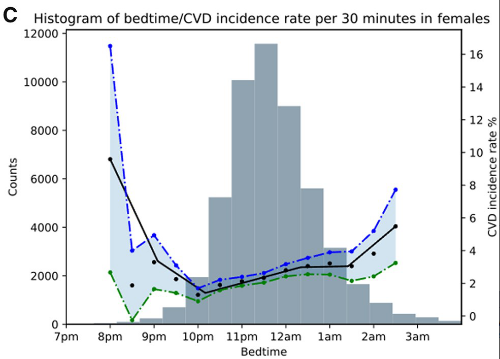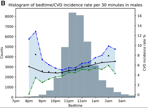 该研究,对英国生物库招募的103,679名参与者进行调查随访,经过纳入排除标准,此研究共纳入88,026名英国参与者,其中包括51,214名女性(58.2%)和36,812名男性(41.8%),平均年龄为61.43±7.8岁。在对患者经过了平均5.7年的随访后,发现有3172名(3.58%)参与者患上了心血管疾病,包括:心肌梗塞、心力衰竭、慢性缺血性心脏病、中风和短暂性脑缺血发作。心血管疾病患者中,43%(1371人)在凌晨及更晚睡,38%(1196人)在11-12点间睡,而仅有15%(473人)在10-11点间睡,4%(132人)在10点前睡。