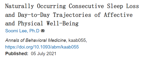 [2] Soomi Lee, Ph.D, Naturally Occurring Consecutive Sleep Loss and Day-to-Day Trajectories of Affective and Physical Well-Being, Annals of Behavioral Medicine, 2021;, kaab055, https://doi.org/10.1093/abm/kaab055