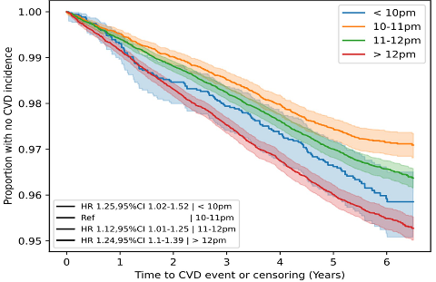 然而,在European Heart Journal-Digital Health上刊登的一项名为《Accelerometer-derive sleep onset timing and cardiovascular disease incidence: a UK Biobank cohort study》的最新队列研究表明,晚上十点到十一点之间睡觉,可以降低患心血管疾病的风险,在凌晨入睡患病风险最高。