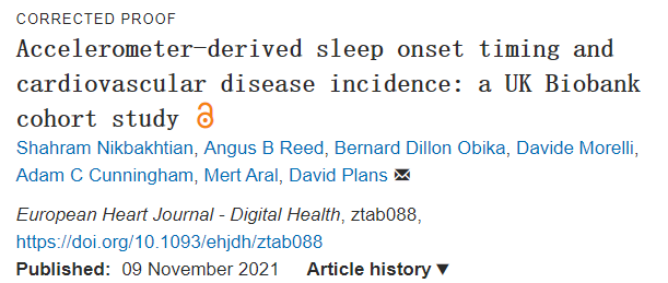 [1] Shahram Nikbakhtian, Angus B Reed, Bernard Dillon Obika, Davide Morelli, Adam C Cunningham, Mert Aral, David Plans, Accelerometer-derive sleep onset timing and cardiovascular disease incidence: a UK Biobank cohort study, European Heart Journal - Digital Health, 2021;, ztab088, https://doi.org/10.1093/ehjdh/ztab088