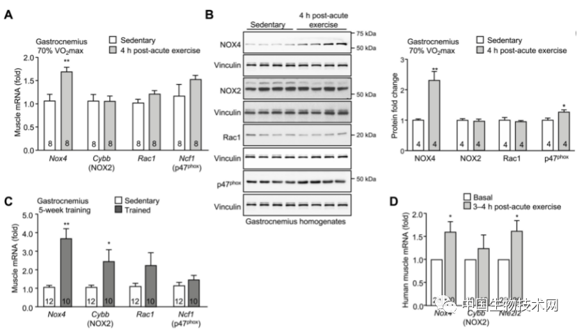 我们知道,运动有一个基本功能是诱导线粒体生物发生,这对于促进呼吸能力和耐力至关重要。研究人员发现,运动诱导的线粒体生物发生需要骨骼肌中的NOX4,而且,骨骼肌NOX4在红细胞衍生核因子2样蛋白2(NFE2L2)介导的抗氧化防御中也发挥着重要作用。NFE2L2被认为是运动后诱导线粒体生物发生和最佳运动表现所必需的。