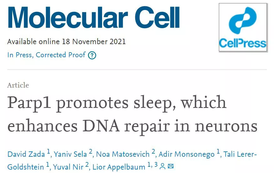 [1] David Zada, et al. Parp1 promotes sleep, which enhances DNA repair in neurons. Mol Cell. 2021 Nov 12;S1097-2765(21)00933-3. doi: 10.1016/j.molcel.2021.10.026.