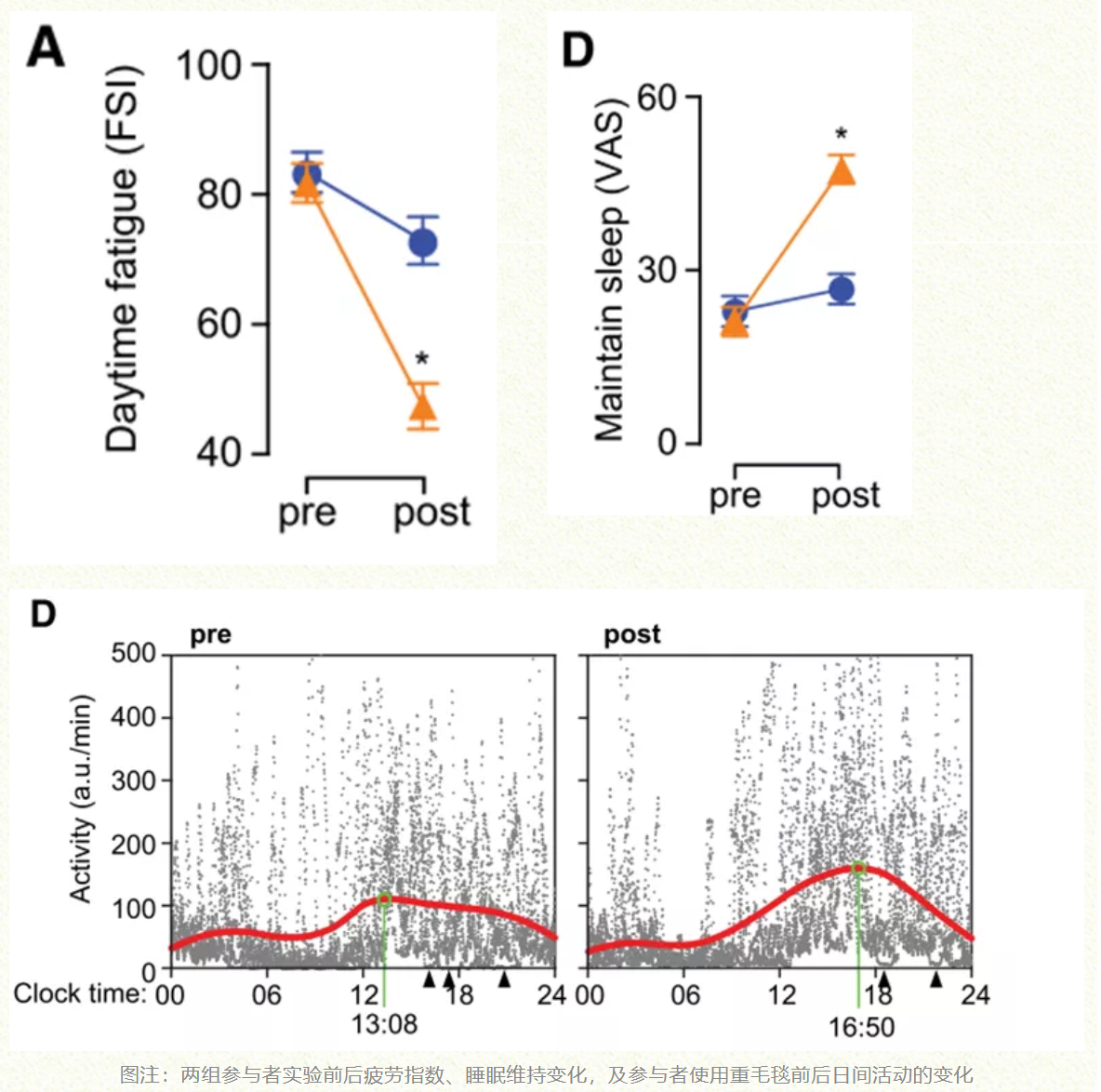 腕部活动记录仪也显示使用重毛毯能够使参与者维持睡眠的能力提高,在失眠症状的改善同时,参与者日间功能也出现了积极的改变:白天活动增加,专注时间更长,休息时间更短。