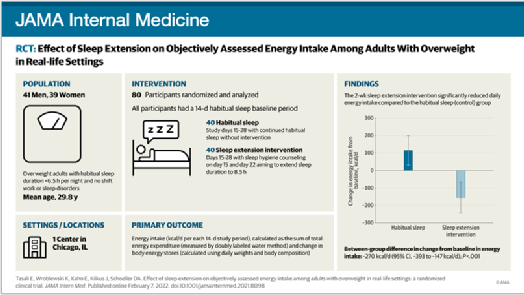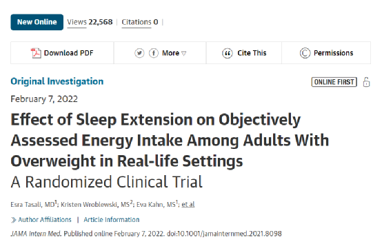 2022年2月7日,美国芝加哥大学医学中心(University of Chicago Medical Center)的研究人员在《美国医学会杂志-内科学》(JAMA Internal Medicine)上发表了一篇题为“Effect of Sleep Extension on Objectively Assessed Energy Intake Among Adults With Overweight in Real-life Settings”的研究论文。该项随机临床试验竟然证实了上述猜想:保证充足的睡眠,确实能有利于减少热量的摄入,降低患肥胖症的风险!