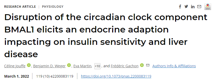 在包括人类在内的哺乳动物中,昼夜节律受到一组核心时钟基因所驱动,其中转录因子脑和肌肉芳烃受体核转运蛋白样1(BMAL1,也称ARNTL)发挥着至关重要的作用,它也是唯一一个单独敲除便可以导致全身昼夜节律紊乱的基因。