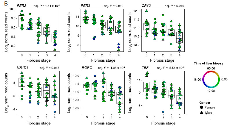 越来越多的证据表明,昼夜节律紊乱的人患肥胖、非酒精性脂肪肝病和肝细胞癌的风险更高。然而,科学家们对其潜在机制,尤其是关于人类疾病中的时钟基因表达仍知之甚少。