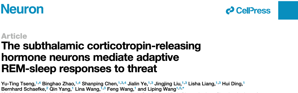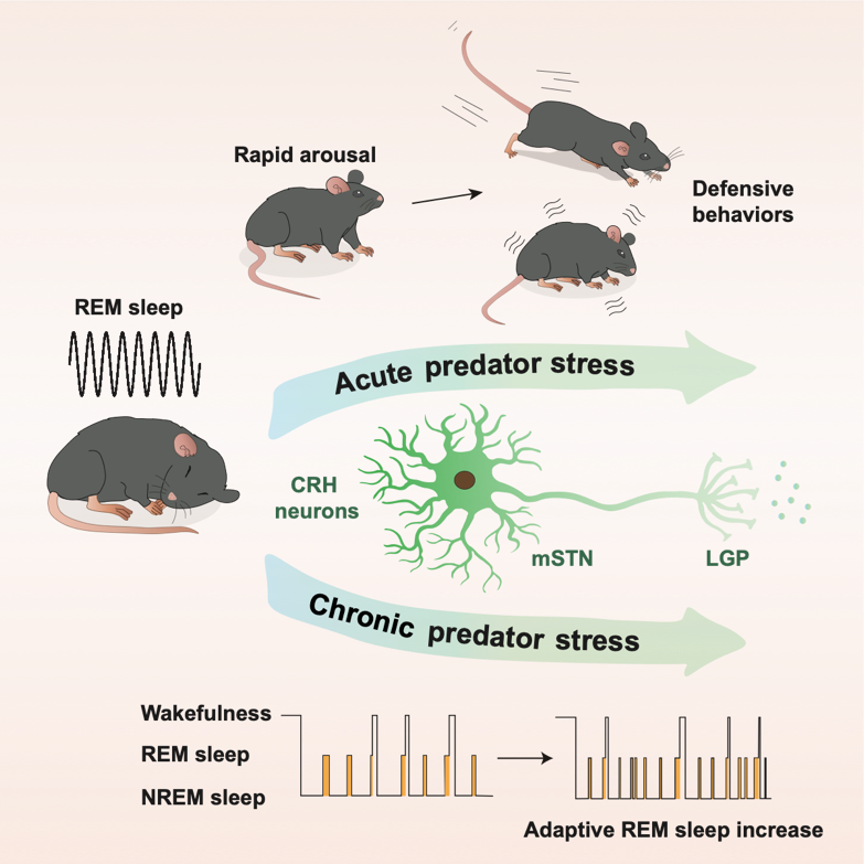 综合使用团队自主研发的小动物眼动监测、以及内窥镜单神经元成像、化学遗传学调控等方法,团队发现相比非快速眼动睡眠,在快速眼动睡眠期间给予动物天敌气味刺激能够更快唤醒小鼠,提示快速眼动睡眠具有潜在“防御天敌”的功能,并且成功解析了一条小鼠大脑中从丘脑底核(medial subthalamus nucleus, mSTN)促肾上腺皮质激素释放激素(corticotropin releasing hormone , CRH)神经元投射到外侧苍白球(lateral globus pallidus, LGP)的神经环路,该神经环路调控了快速眼动睡眠下对天敌刺激的响应。