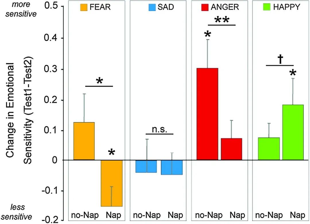 研究发现,在一天中,没有午睡的受试者愤怒程度显著增加,而午睡的一组则没有这么明显程度的增加。在不午睡组中,每一种情绪的情绪梯度逐渐增加。