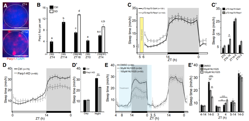 研究小组发现,Parp1在DNA断裂位点的聚集性在清醒时增加,在睡眠时减少。通过基因和药理学操纵,Parp1基因的过表达和敲低显示,Parp1过表达会促进睡眠,也增加睡眠依赖性修复。相反,Parp1的敲低阻断了DNA损伤修复的信号,这造成了一个十分有趣的结果:这些斑马鱼并没有完全意识到自己累了,就没有去睡觉,也没有进行DNA损伤修复。