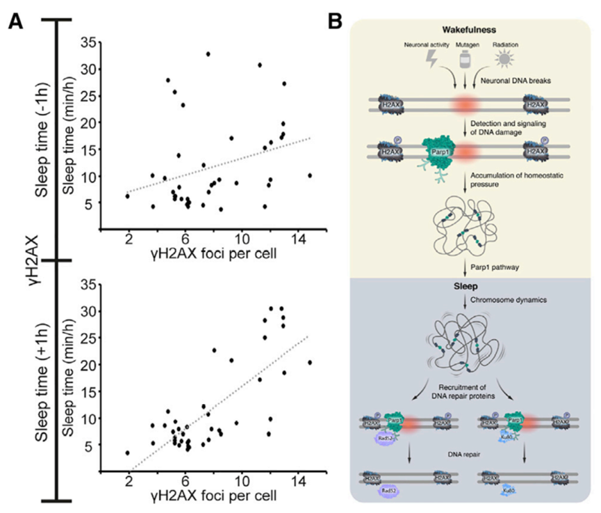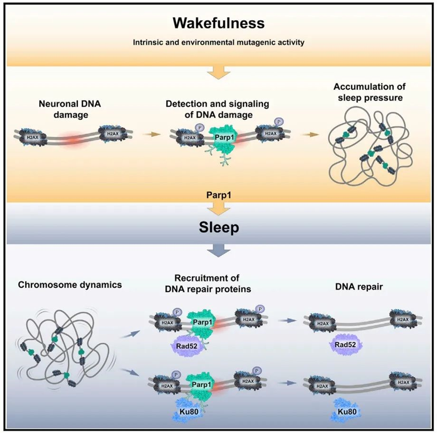 该研究从单细胞水平对为什么需要睡眠进行了详细解释:在清醒状态下,神经元中DNA损伤的积聚会增加睡眠压力,而一种名为Parp1的蛋白质感知到这种不断增加的DNA损伤压力,并发出睡眠信号。在睡眠期间,细胞内进行了有效的DNA修复,降低了驱动睡眠需求的细胞稳态压力。