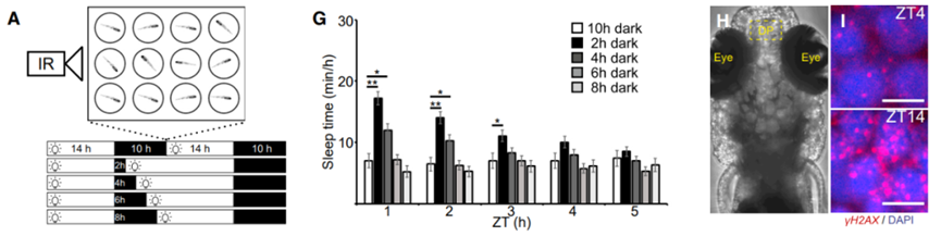 在确定了累积的DNA损伤是驱动睡眠过程的力量后,研究人员想进一步确定斑马鱼需要睡眠的最小时间。和人类一样,斑马鱼对光线的干扰也很敏感,所以可以通过光照来打断睡眠,从而控制斑马鱼的睡眠时间。
