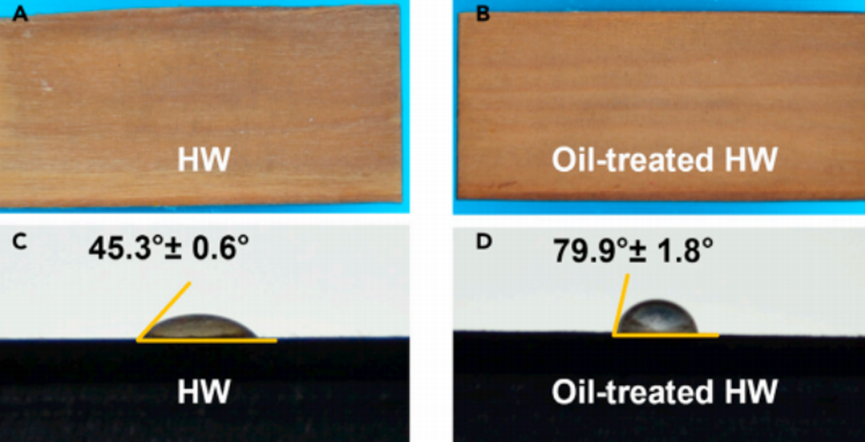 如下图,已形成的硬化木材表面、油处理后的硬化木材表面的接触角分别为 45.3+/-0.6 度和 79.9+/-1.8 度,这表明硬化木材表面的耐水性显著提高。