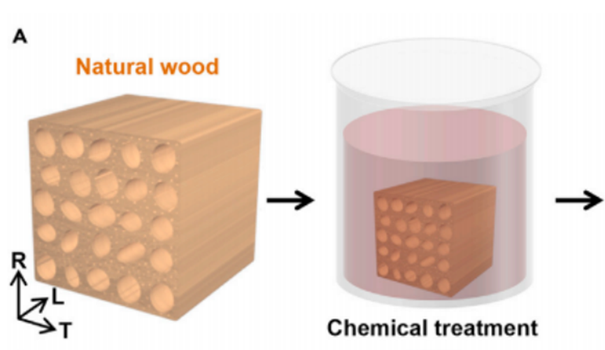 第一步是将木材脱掉木质素,即将木材浸泡在含有氢氧化钠和亚硫酸钠的溶液中,当温度达到 100℃ 下将溶液煮沸几个小时。天然木材的刚性大,不易变形,而在去除木质素后,它会变得柔软、灵活。