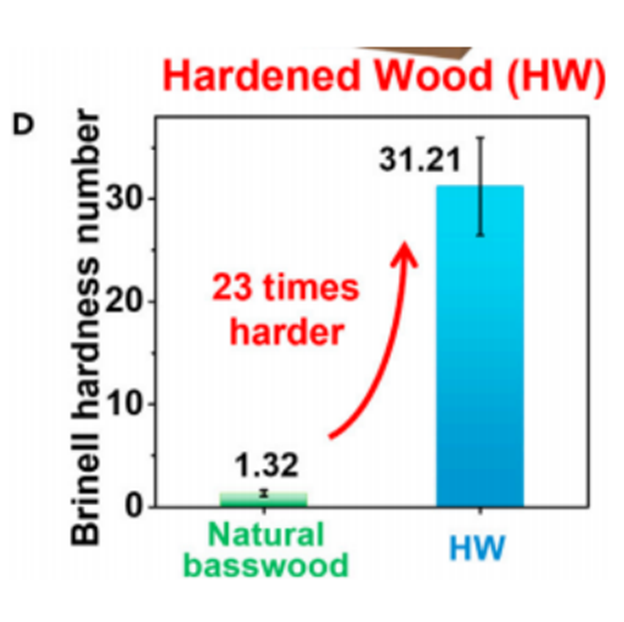 借此产生的硬化木材,比原材料强大 23 倍,原因在于其显著密集的材料结构,可增强硬化木材中相邻纤维素纤维之间的氢键形成。