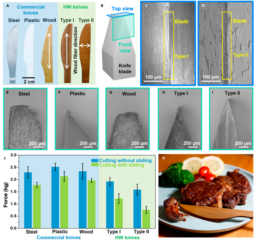 考虑到木纤维排列方向下的各向异性材料结构,他们制备出两种木质刀片:I 型硬化木材刀和 II 型硬化木材刀。前者是木纤维的方向平行于刀片,后者则是木纤维的方向垂直于刀片。