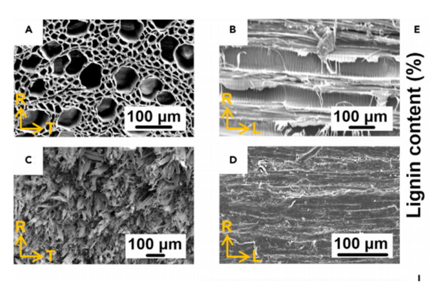 那么,普通木材和硬化木材的硬度有何不同?如下图,图 A 和图 B 分别显示了天然椴木在 R-T 和 R-L 平面上的形态,沿木材的生长方向上,含有很多大小不一的管状通道和孔隙。图 C 和图 D 则显示了硬化木材的相应形态,其中木细胞壁完全坍塌,纤维素纤维密集地平行排列。