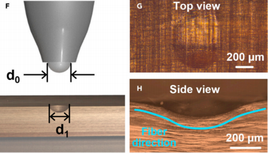 那么,处理几小时可得到最佳硬度?由于布氏硬度试验方法常用于评价材料硬度,基于此他们通过在硬化木材表面施加 30kg 的力而产生压痕。然后使用光学显微镜对压痕进行了表征和分析,结果发现凹部下方的木纤维会变形、并形成弯曲形状。