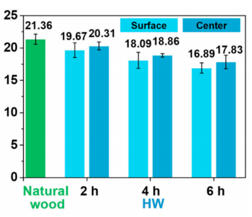 如下图所示,在对硬化木材样品做 2 小时的化学处理时,木质素含量分别为表面 19.67+/-1.13wt%、中心 20.31+/-0.61wt%;做 4 小时的化学处理时,木质素含量分别为表面18.04+/-1.09wt%、中心 18.86+/-0.25wt%;做 6 小时的化学处理时,木质素含量分别为表面 16.89+/-0.80wt% 和中心 17.83+/-1.05wt%。