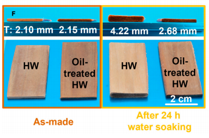 为了进一步证明油处理后的硬化木材的耐水性,他们把它完全浸入去离子水中 24 小时。