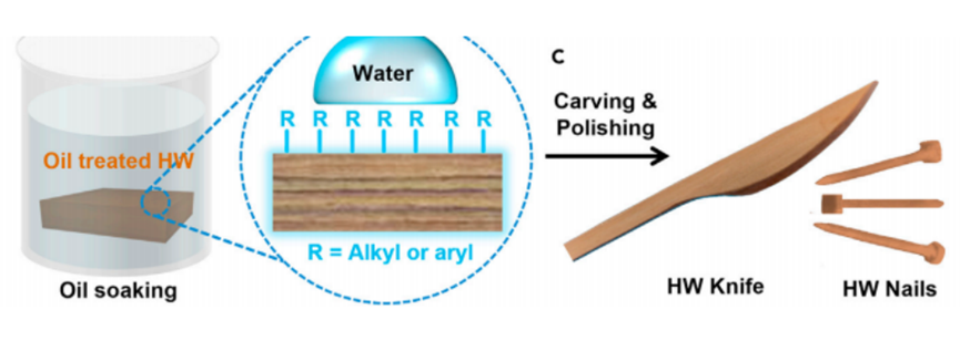然后将硬化木材浸入食品级矿物油中做表面处理,以提高其耐水性。通过切割和抛光,进一步将它加工成木刀和木钉,以展示其作为一次性桌刀和钢钉替代品的潜在应用。