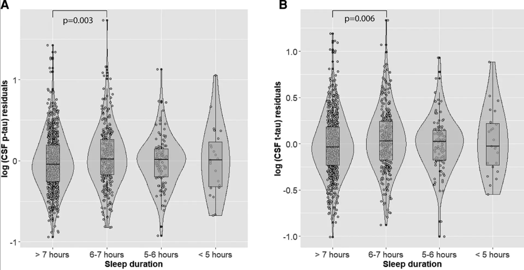 结果显示,与每日睡眠超过7小时的相比,每晚睡6-7小时的参与者表现出更高的脑脊液p-tau水平(p=0.028)。以二分法对睡眠时间进行分类发现,较短的睡眠时间,即睡眠不足7小时,与更高的脑脊液t-tau、p-tau水平显著相关。