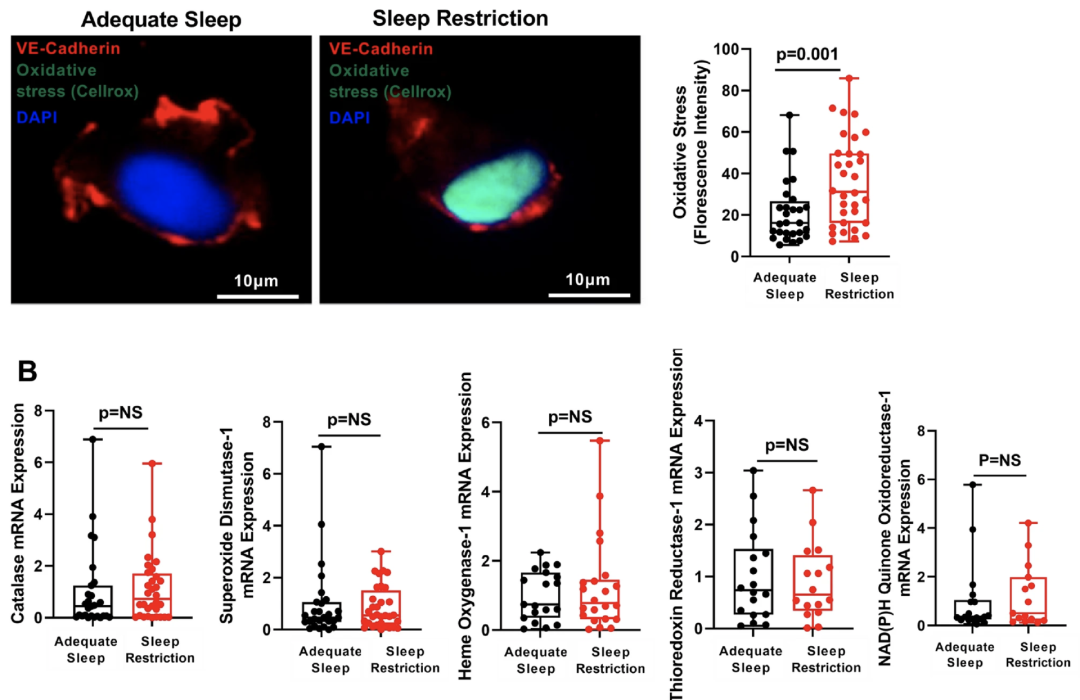 为了直接评估睡眠限制对内皮细胞的影响,研究者使用微创技术新鲜采集了内皮细胞(ECs)。结果显示,与充足睡眠相比,睡眠限制后的内皮氧化应激水平增加了78%,即使基线调整后仍存在。
