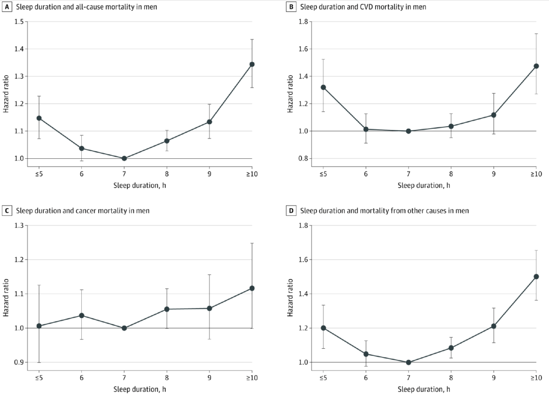 在男性中,与7小时的睡眠相比,每晚睡眠超过该数值,比如达到8、9、10小时,全因死亡率将分别升高9%、18%和43%;而睡眠不足5小时,参与者的全因死亡率也会升高16%。