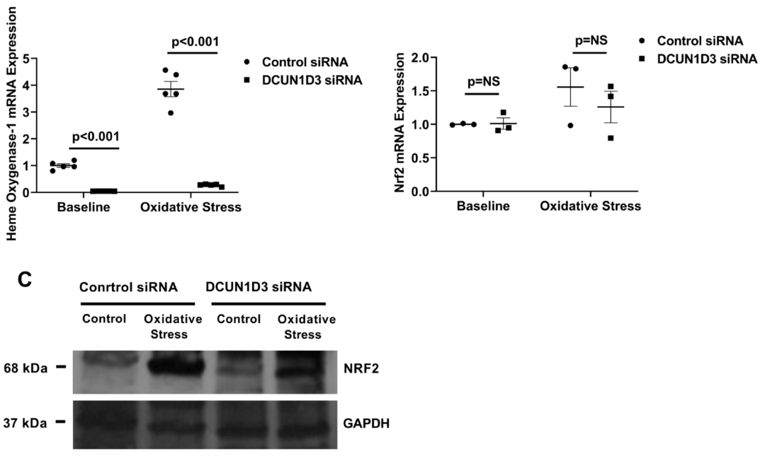 进一步针对EC的RNA-seq分析显示,与充足睡眠相比,睡眠限制后内皮DCUN1D3 mRNA表达显著减少;RT-PCR也证实了这一点,睡眠限制下的内皮DCUN1D3蛋白表达显著减少,进而下调了细胞整体的抗氧化能力。
