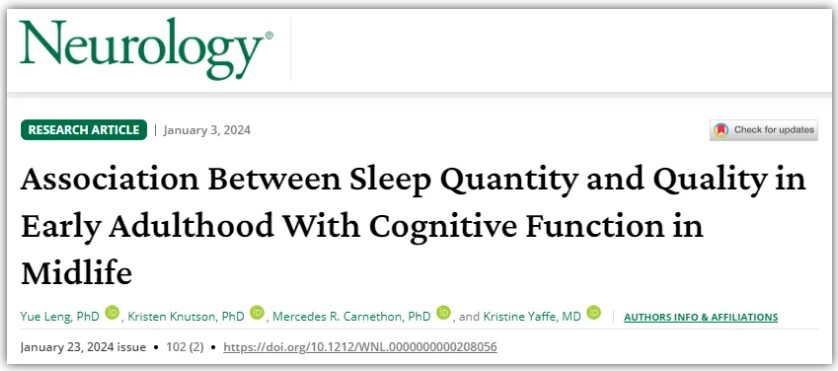 2024年1月3日,美国加州大学旧金山分校的研究人员在" Neurology "期刊上发表了一篇题为" Association Between Sleep Quantity and Quality in Early Adulthood With Cognitive Function in Midlife "的研究论文。