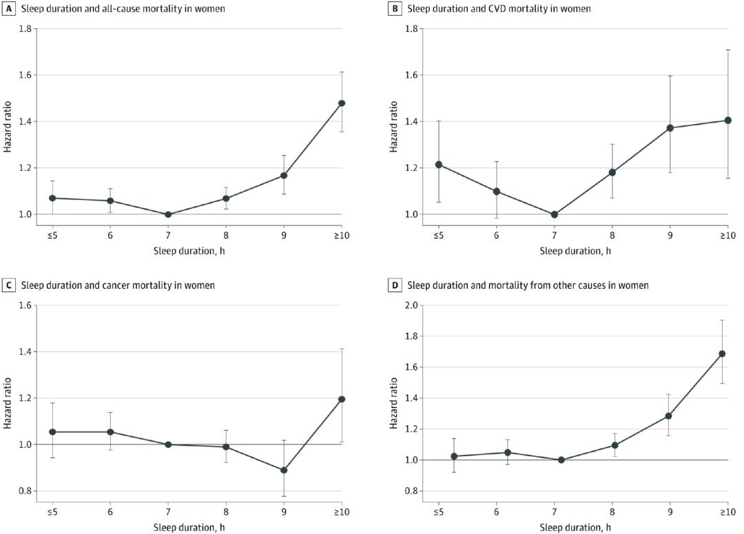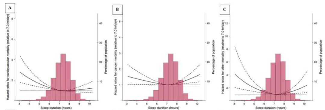 注释:实线代表不同睡眠时长人群的相对风险,可以看到各类死亡率的相对风险最低点都在 7-8 小时这一区间内(图源:文献)