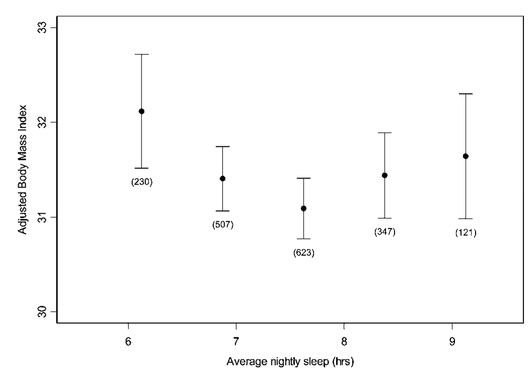 一项在美国威斯康辛州 1024 名志愿者中开展的睡眠健康随访研究发现,睡眠时间与体质指数 BMI 之间的关系呈 U 型相关,睡眠时间过短或过长皆有可能导致肥胖风险增加,最佳时间为 7~8 小时。