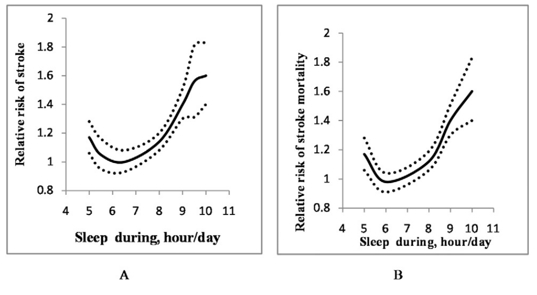 2016 年一项元分析显示,睡眠时间与中风发病率、中风死亡率之间存在 J 型关联,最低点为 7 小时,大约每少睡 1 小时,中风风险会上升 7%,而每多睡 1 小时,风险则会提高 17%。