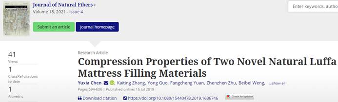 2019年7月16日,本研究中心陈玉霞教授、木材科学与技术博士张凯婷和郭勇教授作为共同第一作者在中科院四区期刊《Journal of Natural Fibers》(影响因子1.252)上发表题为“Compression Properties of Two Novel Natural Luffa Mattress Filling Materials”的研究性论文,通讯作者为陈玉霞教授。