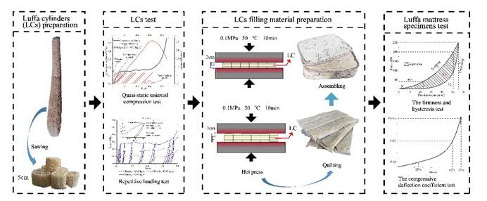 该研究对比研究两种不同品种的天然柱状丝瓜络作为床垫填充材料的潜在价值。结果发现,高密度和低密度柱状丝瓜络的抗压强度和平台应力与其密度显着相关。而且压缩处理对丝瓜络垫的硬度有很大影响。低密度柱状丝瓜络经过压缩至密实化阶段处理后,用其制备的丝瓜络垫的硬度增加,但高密度柱状丝瓜络压缩至密实化阶段后,由其制备的丝瓜络床垫的硬度却降低了。