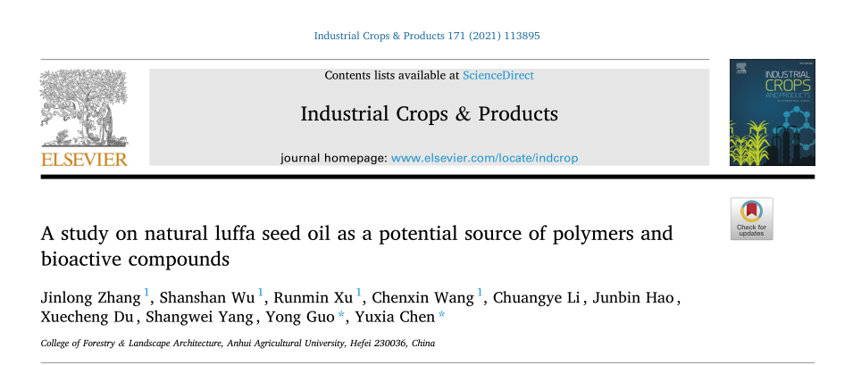 2021年08月01日,中科院1区TOP期刊《Industrial Crops and Products》(影响因子5.645)发表了一篇题为“A study on natural luffa seed oil as a potential source of polymers and bioactive compounds”的研究性论文,林业工程专业硕士研究生张锦龙、邬珊珊、王晨欣以及博士生徐润民作为共同第一作者,通讯作者是本研究中心的陈玉霞与郭勇教授。