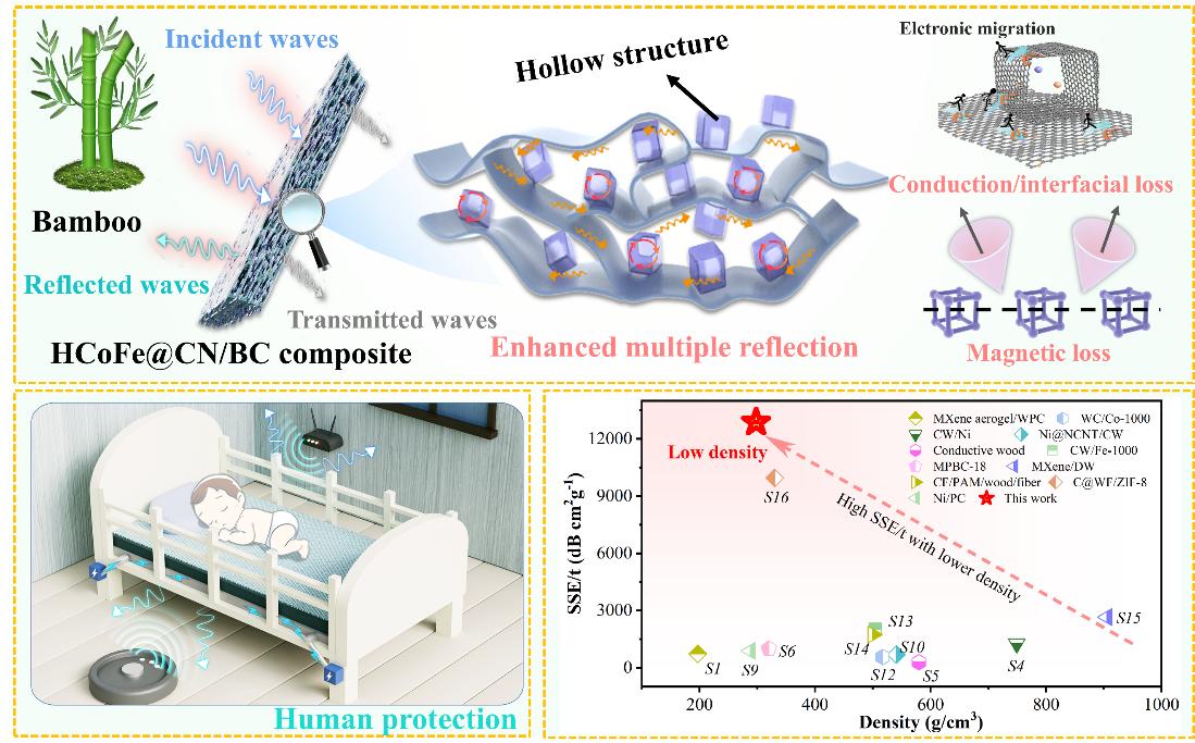随着智能家居与物联网设备的广泛普及,室内外电磁辐射源急剧增加,电磁干扰问题愈发突出。这类“电磁污染”不仅影响无线通信质量和智能系统稳定运行,还可能对人体健康造成潜在威胁。因此,开发兼具高屏蔽效能(SE)、低反射率与轻量化的可持续EMI屏蔽材料成为迫切需求。针对这一挑战,陈玉霞教授团队提出并制备了一种超薄、轻质的空心磁性CoFe碳纳米笼嵌入竹衍生碳化复合材料(HCoFe@CN/BC)。该材料通过在纤维素支架上原位生长CoFe普鲁士蓝类似物,再经过酸蚀刻、压缩与碳化工艺获得。连续的电磁耦合网络可实现多重能量耗散,而独特的空心结构不仅有效降低材料密度,还促进了电磁波的多次内部反射,显著增强屏蔽性能。性能测试表明,厚度仅0.14 mm、密度0.278 g/cm³的该复合材料,实现了50.1 dB EMI屏蔽效能、仅6.57 dB的平均反射值以及12872.6 dB cm² g⁻¹的比屏蔽效能,性能优于绝大多数已报道的生物质基材料。此外,该材料在焦耳热性能方面同样表现优异,仅在2 V低电压下,表面温度即可快速升至118 ℃,智能家居低压供热的应用潜力。基于这些特性,HCoFe@CN/BC已在装饰建材与智能家居系统中完成实际应用验证,充分展示了其在电磁防护与热管理领域的广阔前景。