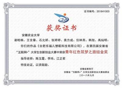 2018年《合肥乐福儿慧眠科技有限公司》曾参加第四届“互联网+”大学生创新创业大赛获得国家级铜奖、安徽省青年红色筑梦之旅金奖以及校级特等奖